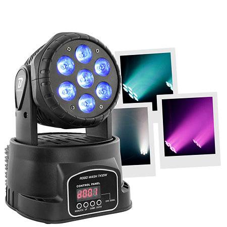 Lyre motorisée Wash à LED BoomTone DJ Robo Wash 7X12W. Elle dispose de 7 LED 4-en-1 quadri couleurs permettant un mélange de couleurs homogène. Idéale pour la mise en couleur de bars, petits clubs et également pour les discomobiles.